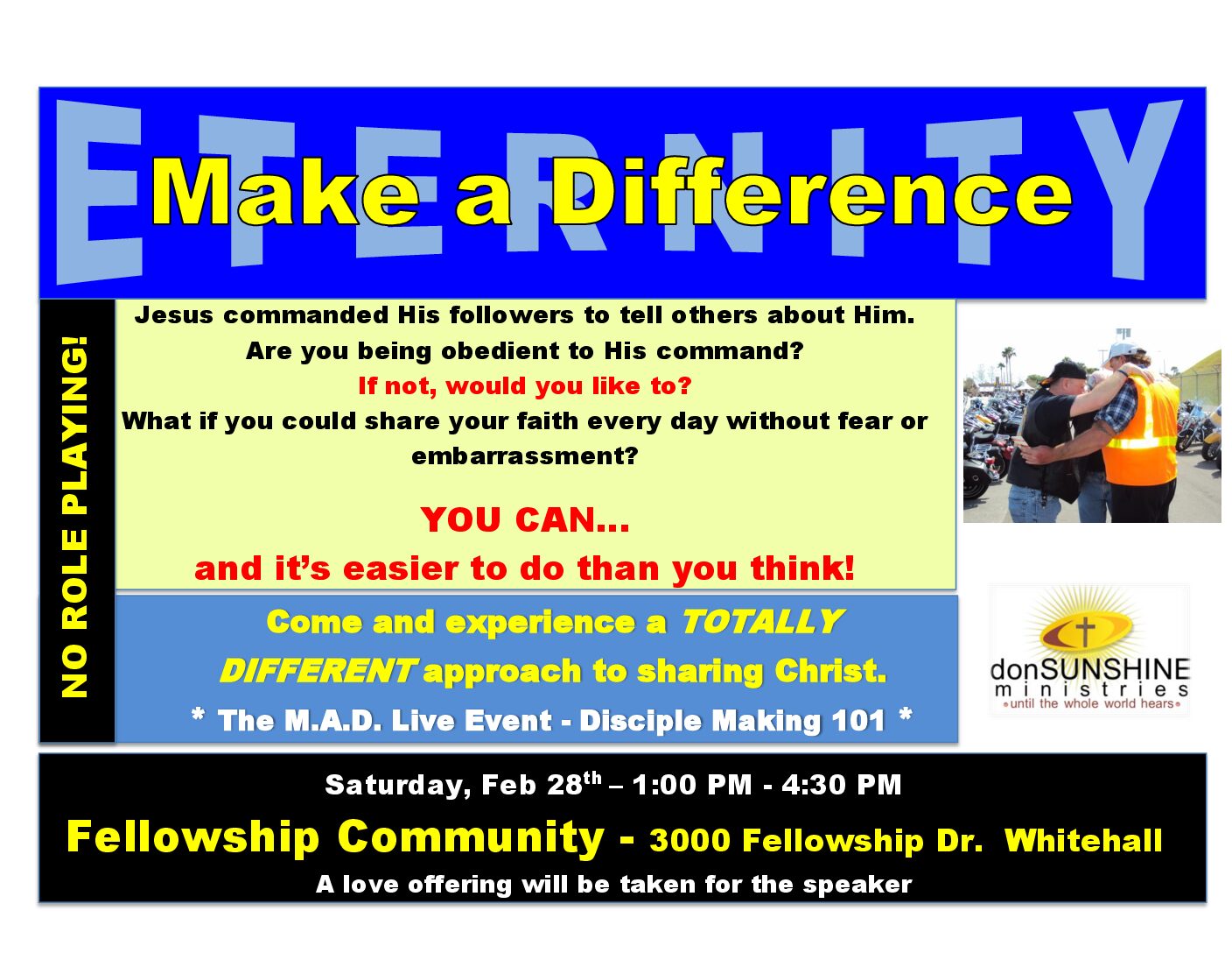 Friends, We’re excited to share that Evangelist Don Sunshine will be presenting his Make a Difference event — a powerful session designed to help us recognize the everyday opportunities God gives us to share our